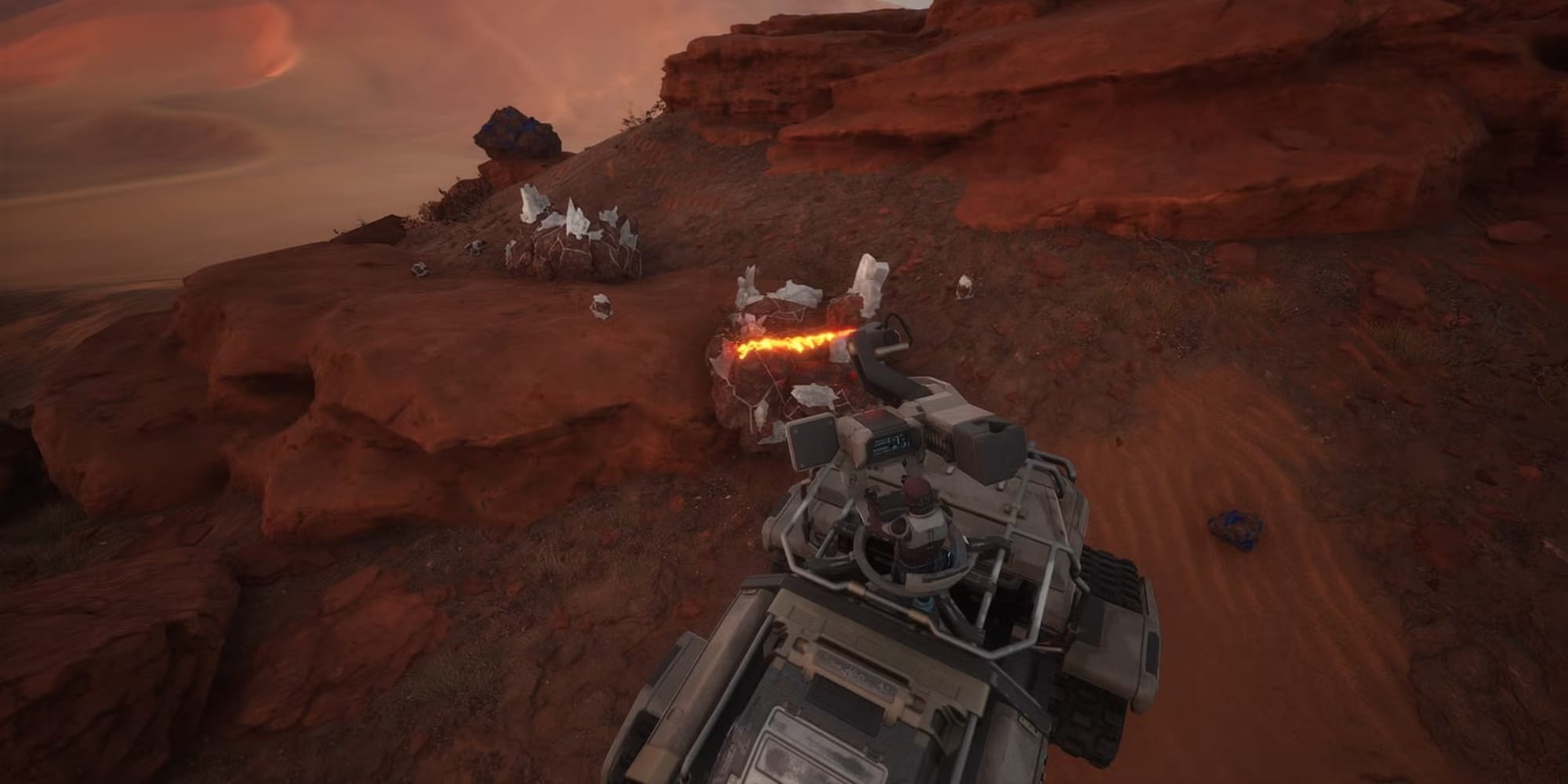 Carbon Ore tends to appear in a belt surrounding the southern cliffs near the open dunes, so circle the perimeter and watch carefully for white chunks protruding from rocks.
