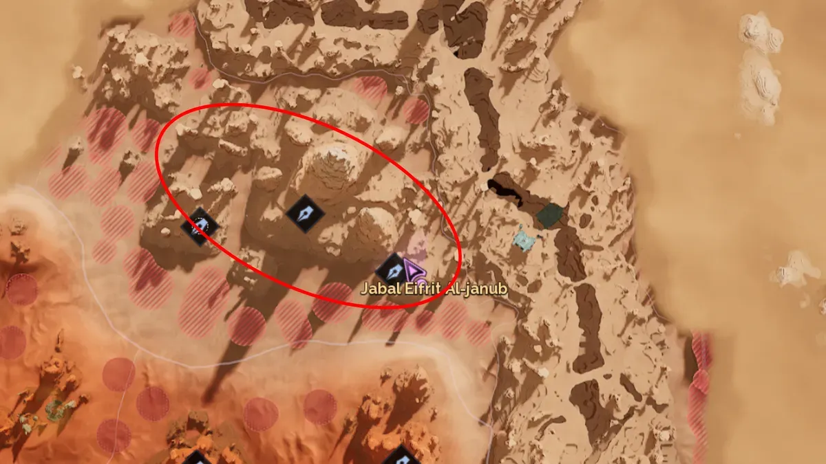 You'll discover carbon ore nodes near the drum sand in southern Jabal Eifrit Al-janub, as well as in the hills close to the border with Hagga Rift. Jabal Eifrit Al-janub lies just north of The Anvil Tradepost, making it an ideal fast-travel spot for carbon collection—assuming you've already visited it once.